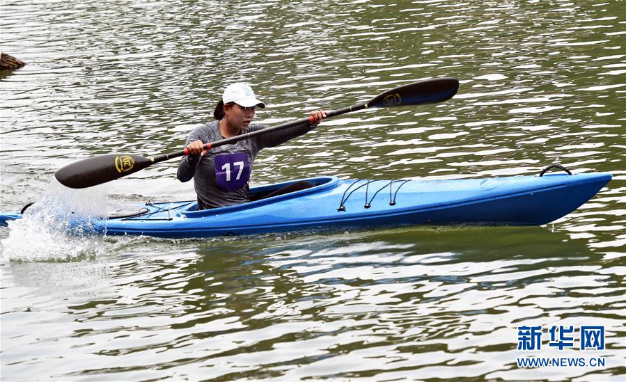 4月5日,女子组6公里挑战赛冠军云南队选手方翠(中)、亚军四川攀枝花队选手王莉(右)和第三名四川队选手李雯在领奖台上。当日,在云南省勐腊县望天树风景区南腊河举行的2017全国皮划艇勐腊热带雨林挑战赛闭幕。